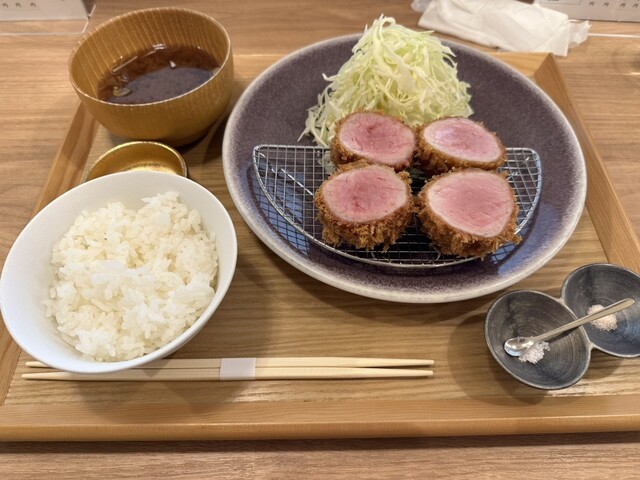 お肉はレアの仕上がりで輝いて見え、見た目からとても美味しそうです。塩をかけて食べます。お肉のジューシーさと甘み旨みに大変感動しました。衣が薄いためお肉の味をしっかり感じることができ、いい感じに絡んで美味しくいただけます。とんかつの概念が本当に変わります!