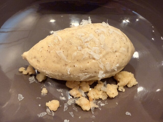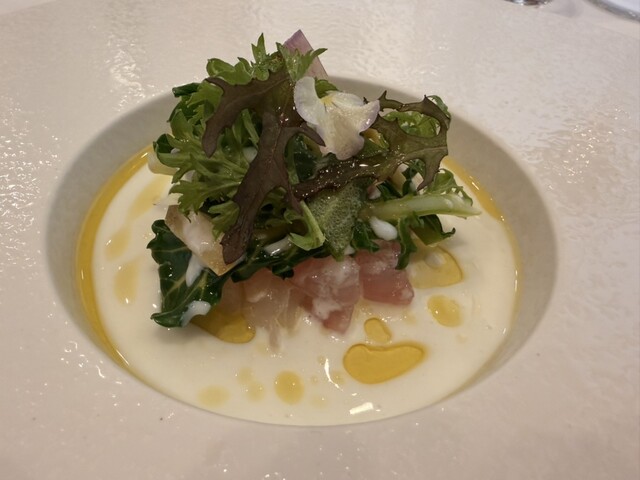 お料理は一品一品趣向を凝らしてあり、イタリアンなのに、たこ焼きみたいな中かチーズの前菜と、ちっちゃいグラスビールみたいなにんじんのムースから始まり、わくわくしました。お肉はこの日は鶏肉でした。皮がパリパリで2種類の部位を使っていて、とてもおいしかったです。