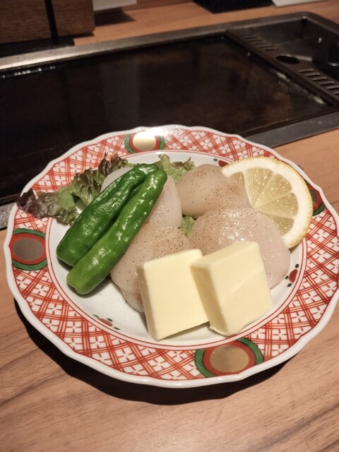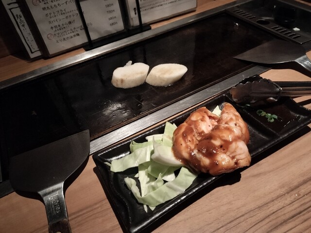 ファーストドリンクは、LINEの登録で無料となる嬉しいサービス(その後も定期的にクーポンが届きます)。カウンターの前にちょっとしたプライベート鉄板があって、単品ものの鉄板焼きが楽しめます。看板メニューのにしか焼きはビジュアルが女性ウケ間違いないですね。カウンター鉄板の上に鉄板ごとのせられ、冷めることなく頂きました。