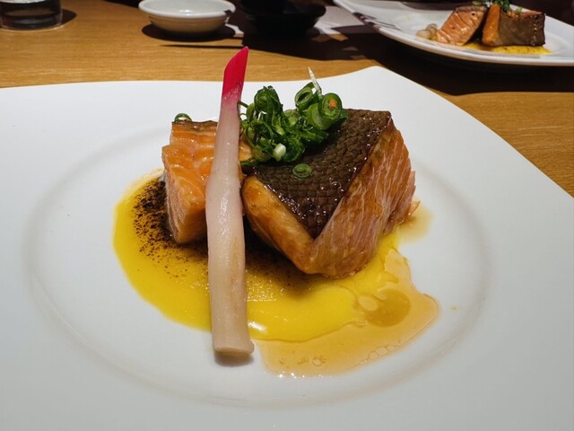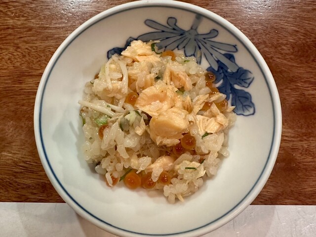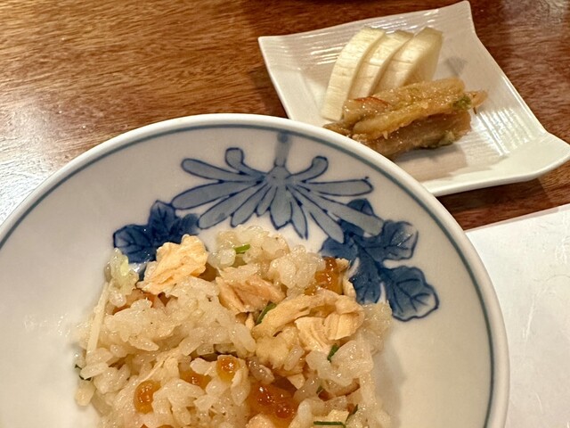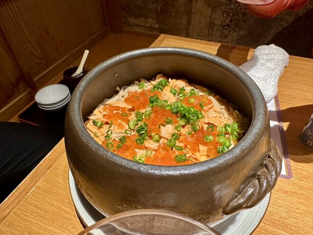 〆の鮭といくらの土鍋ご飯は、蓋を開けた瞬間の香りが最高!ふっくら炊き上がったご飯に、たっぷりの鮭と宝石のようなイクラ。五感で楽しめる逸品です。