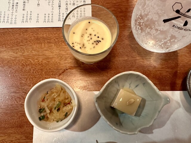 前菜三種(くらげ、とうもろこしのすり流し、胡麻豆腐