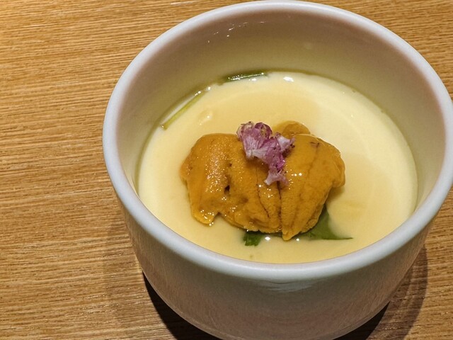 濃厚なウニの旨味と出汁が溶け合う茶碗蒸しは、口の中でとろける贅沢な味わい。