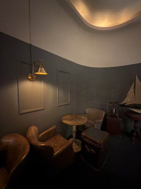 全20席ほどで、重厚なソファやランプが並び、まるで英国の書斎にいるような落ち着いた雰囲気です。