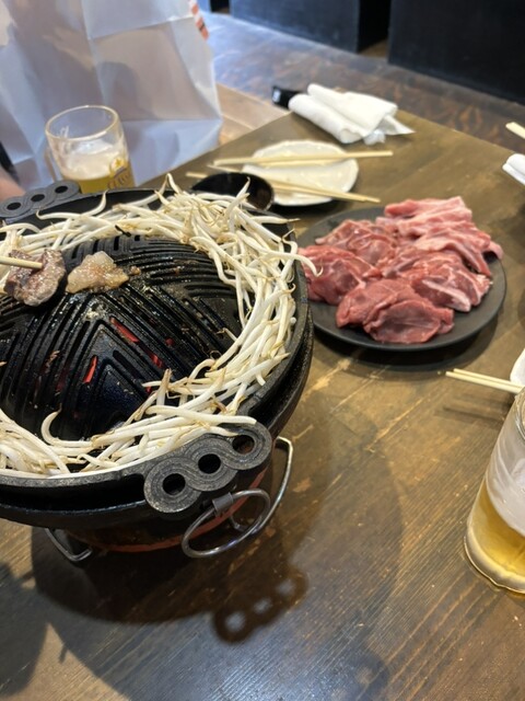 男7人の旅。前日、海鮮物でしたので北海道ならジンギスカンが良いとネットで予約。入店時、1組先客。食べ物(ジンギスカン)は店員さん(店長?)にお任せ。昼ビールを煽る。肉は捌きたての為、3、40秒焼く程度で良く赤色が残っていてもOKとの事。(カルビだけ脂が多い為良く焼く事)最初にヒレ。ジンギスカンにヒレ?言われる通り焼き藻塩?に付け一口。美味い。柔らかく旨み強い。今まで食べたジンギスカンとは別もの。ロース、ラムタンなどもどれも美味い。他数種類の肉とフレンチラムラック、野菜盛り、ビール、7人でボトルワイン4本で66,000円ちょっとでした。大満足。札幌に本店があり平成ノブコブ吉村さんが人生最高のレストランで紹介した店のようです。最高のジンギスカンでした。