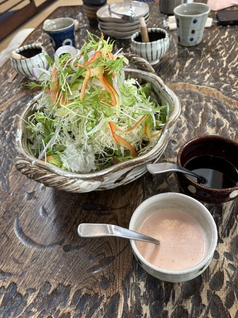 前々から気になっていた一保堂さんへ4人で初入店。店内は古民家を改装しとても綺麗でモダン。奥に白壁の蔵の扉がある。テーブルも凄い。龍が彫られている一枚板。注文はヒレのハーフ&ハーフと焼きのロース。最初に野菜サラダが到着。なんと多い。本当に4人前と疑う。店の奥様よりドレッシングはウスターソース?とオーロラソース?を半々がお勧めと聞きやってみた。お勧めです。かけ過ぎには注意です。本題のカツは焼かれている分余分な脂が落ち好きです。ヒレは普通パサパサ感があるがジューシーで旨味がある。ロースは脂が甘い。柔らかく美味いです。ご飯も美味しく「つや姫」?かな。お腹いっぱい。でもデザートもあり。レモンシャーベット?お口直しに最高です。少々高めですがリピ確定です。皆さんにお勧めしたです。