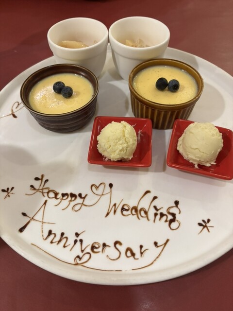 ◯デザート3種。結婚記念日のプレート有り。ありがたいやら恥ずかしいやら。写真の撮り方が悪く実際は3種有り。果実のコンポートとプリンと芋のアイス。皆スッキリした甘さで美味しかったがアイスの容器が小さく取りずらかったのがマイナス。