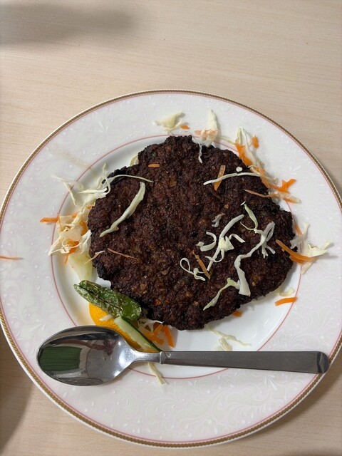 おおっ! サイズが大きい!(比較でスプーン置いてみる) 切ってみると揚げ焼きで表面はしっかりカリッと歯応えザクリ。対して中はふわふわでもの凄く柔らかジューシーです! この薄さで火入れが素晴らしい。スパイス、塩も強すぎる事なく、でも満足出来る匙加減。野菜の甘みもありめっちゃ美味しい! 人生3度目のチャプリカバブですが、すみませんダントツNo.1です。