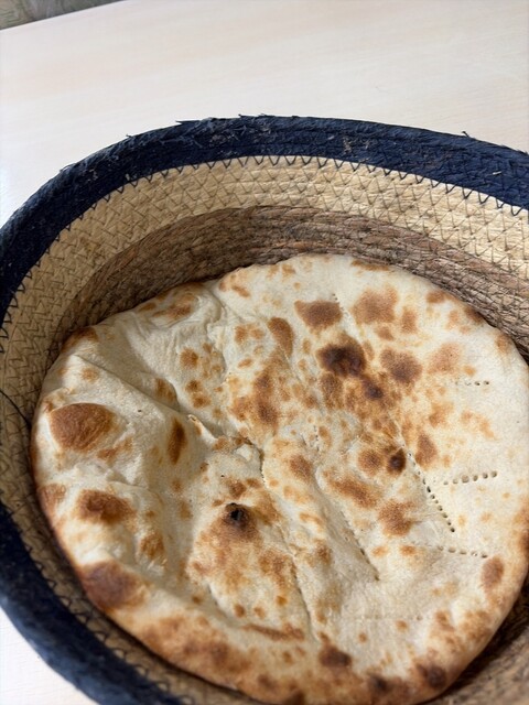 記憶より大きくなった気がする笑 手の平サイズ! 外側はザクッとした食感(黒いですが、焦げの苦さはありません!)中はふわほわジューシー! 肉の旨味が凄い! シャリな玉葱ピーマンの甘みと瑞々しさとホールスパイスのプチが時々弾け爽やかな香りが良いアクセントです。 チャプリカバブだけ食べてると塩強めですが、ナンに挟むと丁度なバランスに。ナンに肉汁が染みて…はーめっちゃ美味しい! サラダも挟むとまた良い。 ここでしか食べられないナン! 焼き立てはバリッ!サクッ! 熱が落ち着いてくると細やかな生地がムチッグイーンな食感になりずっと美味しいんです。噛み締めてじっくりいただきました。