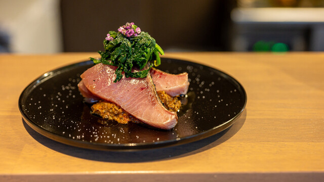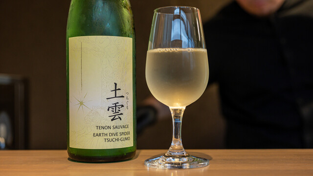 皮霜ヒラマサ マスタードと野菜添え: 素晴らしい一品でした!皮霜ヒラマサは、魚の脂の旨みと皮の食感を同時に楽しめ、黄芥子の爽やかな酸味との相性も抜群でした。野菜が食感のアクセントになっています。店主おすすめの日本酒「土雲」と合わせると、非常に豊かな味わいが口の中に広がりました。
