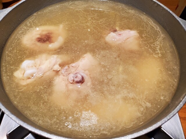 お鍋は、まずスープ(薄め(塩で調整))を一杯。そしてモモ肉とスネ肉が取られて、モモ肉は激しい弾力に包まれ、スネ肉は脂身に包まれ柔らかい。