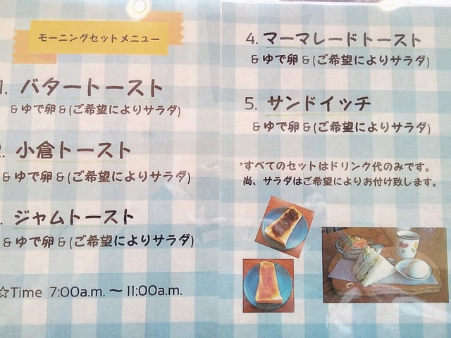 コーヒーは単品は380円になっていましたが、こちらのお店はモーニングがよさそう。飲み物代だけで、トーストorサンドイッチにゆで卵とサラダが付くようです。