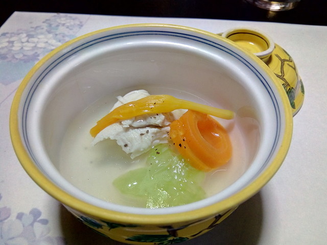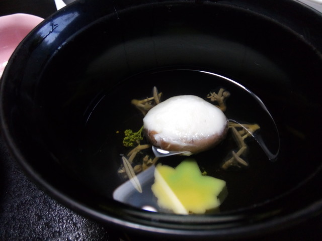 で、また飴煮としばし格闘をしていたら、しんじょと蓴菜の椀物がきました。飴煮を最後まで置いておこうかと思ったのですが、冷めてくるにつれて、身の固さが増してくるので、つい手を出すと、お水をいただいても、他の料理の味にかぶって・・・。