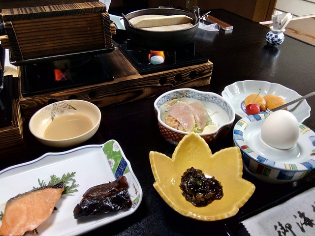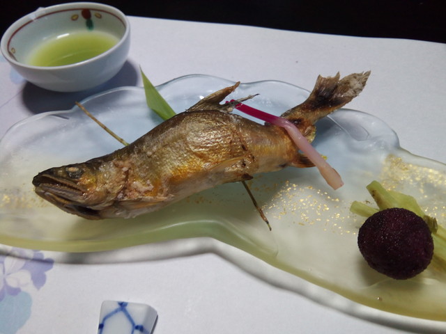 懐石料理の宿とうたうなら、やっぱりお造りの前に陶板焼きや鯉の飴煮はないと思いますし、鯉の飴煮が結構大きくて、味もきついので、全体の料理の流れの中ではもてあましてしまいました。グレードアップで鯉の飴煮と陶板焼きがついているなら、グレードアップでなくてもいいかなと思えました。