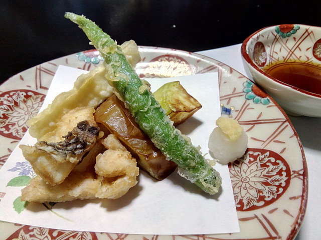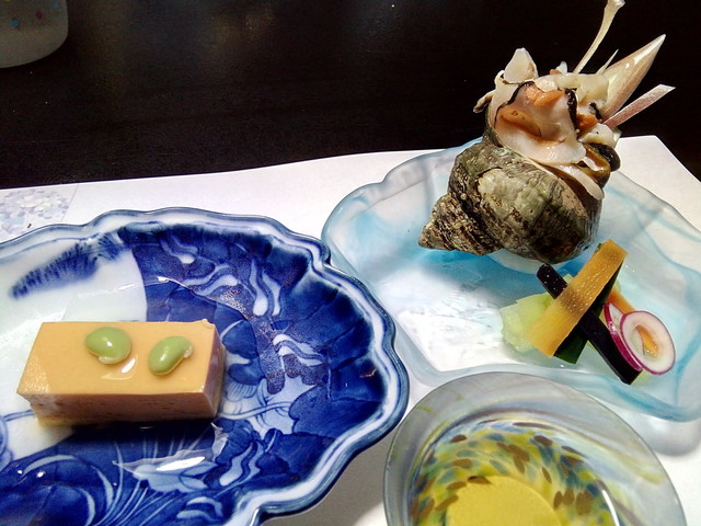 その後、鮎の塩焼きや蒸し物、天ぷらと続きます。天ぷらは、何故か、茄子だけが素揚げで、油をたっぷり含んでべたついてしまっていたので、残してしまいました。酢の物はサザエの刺身とうに豆腐。