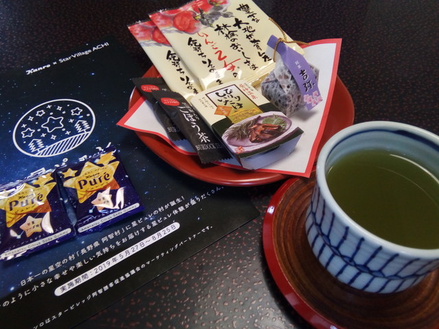 お部屋にはお菓子も、お宿の名前のついた羊羹のような和菓子、リンゴのせんべい、ヘブンス園原の星のクッキー、椎茸の佃煮、ゴボウ茶と贅沢に用意されています。浴衣も一人2枚、女性用は1枚は色浴衣、フェイスタオルやバスタオルも2枚ずつ用意されています。朝にはロビーでコーヒーのセルフサービスもあるし、お風呂も本館、新館ともゆったりして、ツルツルの泉質も申し分なし。お宿としてはかなりCPがいいと感じましたが、ここは食べログ。料理について、レポートします。