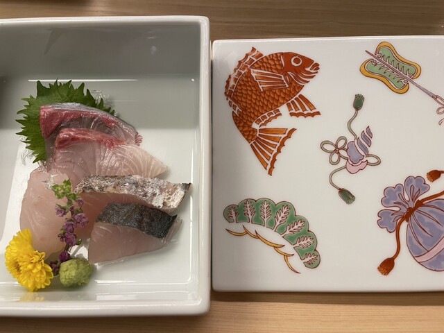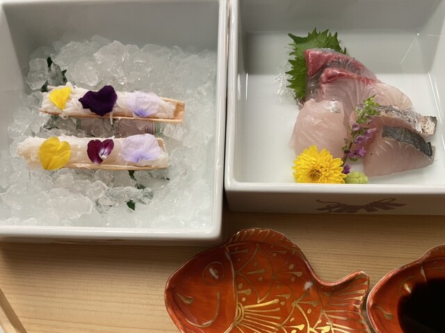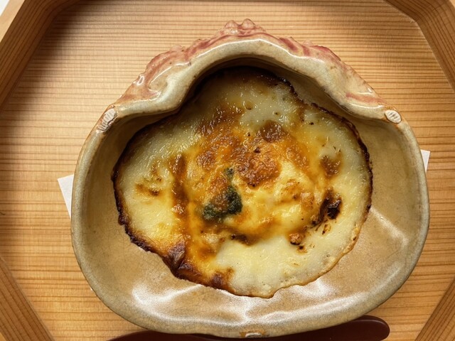 次にかにの真丈。それから陶器の二段の重箱の器にカニとお魚のお刺身。カニグラタン。そして、蟹身がたっぷりと入った釜炊きご飯。めちゃ美味しー♪