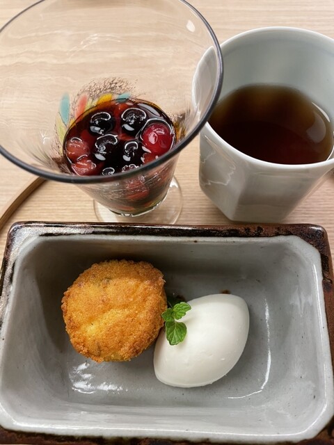 お肉の鍋もありました。最後にデザート3種いただいて、大変美味しかったです。
