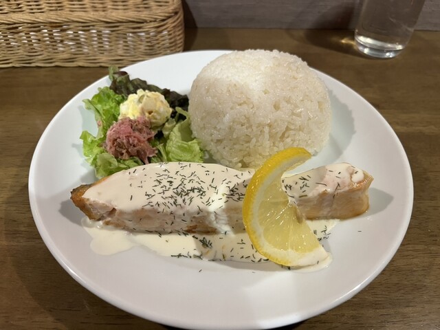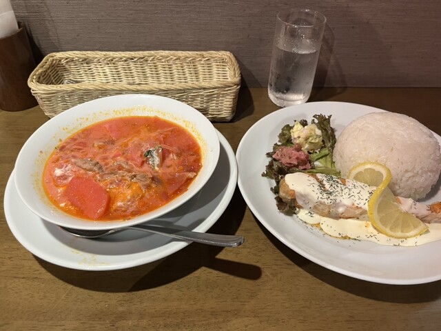 まずボルシチ、美味しいです‼️今回はフルサイズなのでたっぷり堪能できます。普通サイズはコーヒーカップに入ってるのでかなり量が少ないから、ボルシチ好きな方ははじめからフルサイズにされるといいと思います!ミルクと混ぜたらピンク色に変わりました。混ぜないほうが雰囲気的にはいいけれど……。サーモンステーキはタルタルソースみたいなものにレモンをかけて食べるととても美味しかったです。はじめはレモンなしで食べてみましたが、レモンを絞って食べる方が断然美味しいです‼️ご飯も大盛り2倍でかなり満足なランチでした。お値段もボルシチをフルサイズにしてもらって1250円。