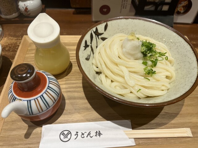 生醤油うどん来ました。うどんの上にネギと大根おろしがのってるだけです‼️あと醤油とレモンみたいなかけるやつ(笑)。うどんがとても美味しいです。やはりうどんの麺はうどん棒さんが1番です‼️限定うどんもいいですが、うどんと醤油だけのシンプルなものの方がうどんの美味しさが際立つように思えました。