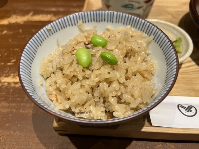 炊き込みご飯はかやくご飯で上にお豆さんが3つのってます。なんか可愛らしいですね(笑)。
