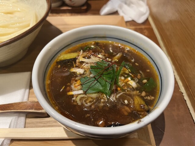 麻婆のつけ汁はちょっぴり辛くて、それが不思議とうどんととても合ってました。当たり前ですが麻婆豆腐ではなく麻婆茄子なので茄子が入ってます(笑)。この段階で僕は麻婆豆腐と勘違いしてました(笑)。麻婆茄子ももちろん美味しかったです。辛過ぎないところが僕には良かったのかも……。