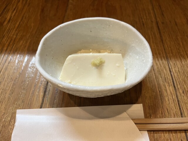 月山膳には、もりそば、かき揚げ、とろろご飯、とうふが出てきます。とうふはおそらく自家製の優しい味。生姜がほんの少しなってます。お醤油なしの方が美味しいです‼️