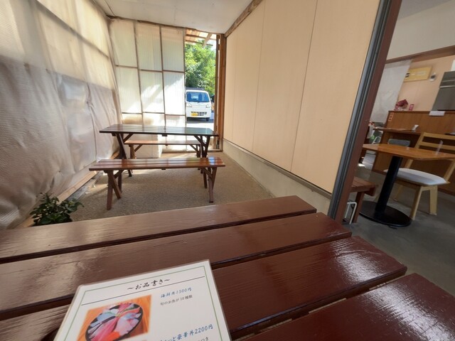 簡易小屋みたいな場所に4人がけで2卓あります。