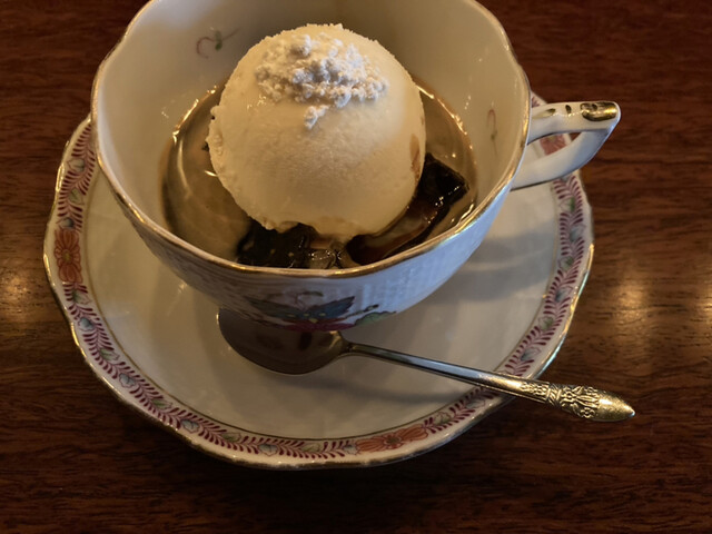 で、それと名物のコーヒーゼリーをオーダーしたのですが、アイスコーヒーと聞いたのに出てきたのはアフォガード!