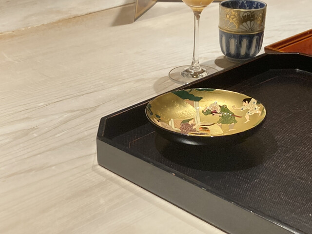 また、このお椀は京都の女性塗り師にオーダーして洛中洛外図屏風の部部分部部分をふた裏に描いてもらったそうです。