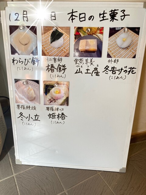 あと、コチラ、冒頭に書いたように写真撮影は禁止なのですが店内はお菓子の木型や葛粉の成分かな?試験管に入ってたような気がする…興味深いモノがたーくさんあってパシャパシャと撮影したかったのですが、残念ながらお菓子の説明書のホワイトボードのみです。