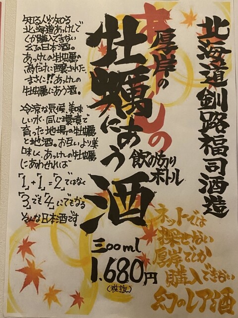 牡蠣がとにかく大ぶりで感動しました!生牡蠣の3Lサイズなんて、名古屋でこんなにちゃんとした生牡蠣が食べれるんだってびっくりしました。