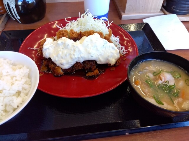 ボリューム満点のチキンカツに、タルタルがのっており、チキンカツの下にソースもあります。 チキンカツに付けても良いですが、キャベツと一緒に食べても美味しいです。 定食は豚汁が付いているので、大好きです。 やっぱり手軽に揚げ物が食べたい時は、かつやは定番です。
