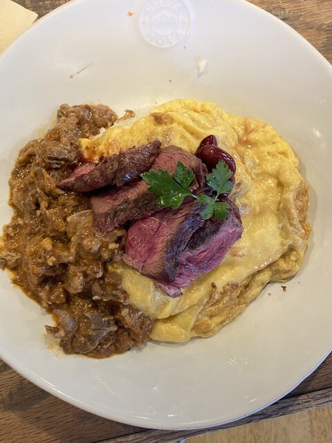 白いご飯にしっかり目に焼いた卵をのせ、ビーフシチュー、ステーキをトッピング。一皿でいろんな味を楽しめました。ただ、肉をがっつり食べたい、と思う人には別のメニューがいいと思います。
