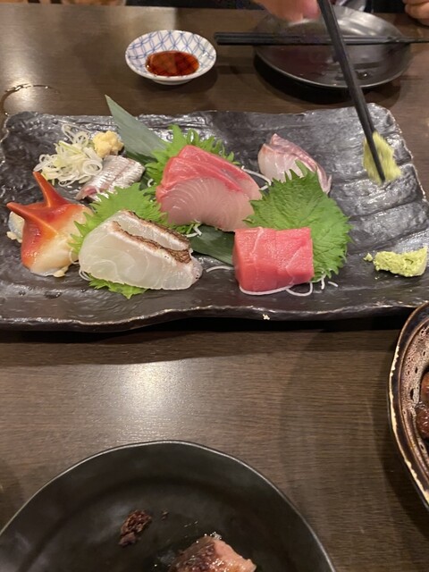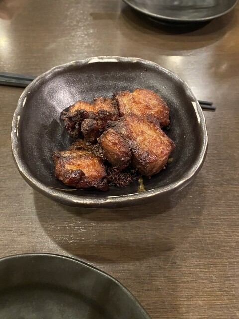お通しの唐揚げマグロらしいです、これがお代わり自由。贅沢なお通し。お刺身も厚みがありそれぞれに魚の味がしっかりわかる上等な刺身。マグロなんてとても厚くて美味い。