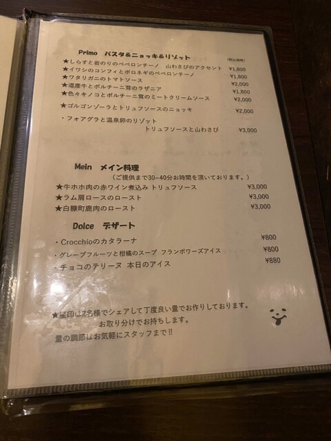 一通り酒を頂き、その他スープとアンティパストを一品頂き お会計は2人で13000円。