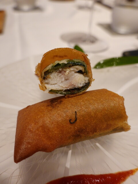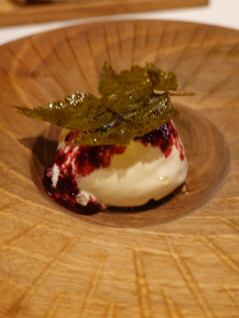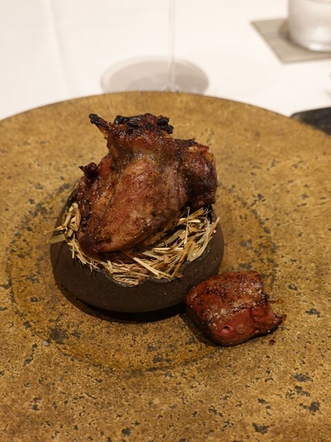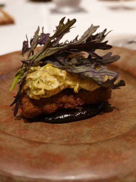 料理:夏子鹿のフィレ、上澄みバターでパン粉揚げ、プルーンと黒にんにくのソース、レタスと芥子菜