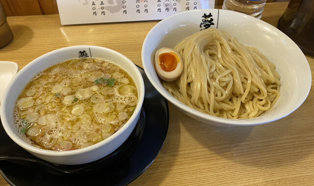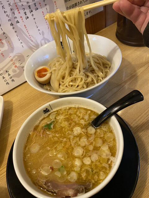つけ汁は名古屋コーチンと岡崎おうはん丸鶏の清湯スープに魚介の旨味に塩ダレを合わせ、蛤の大きなむき身が4ヶが美味しすぎます。