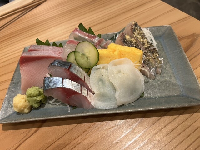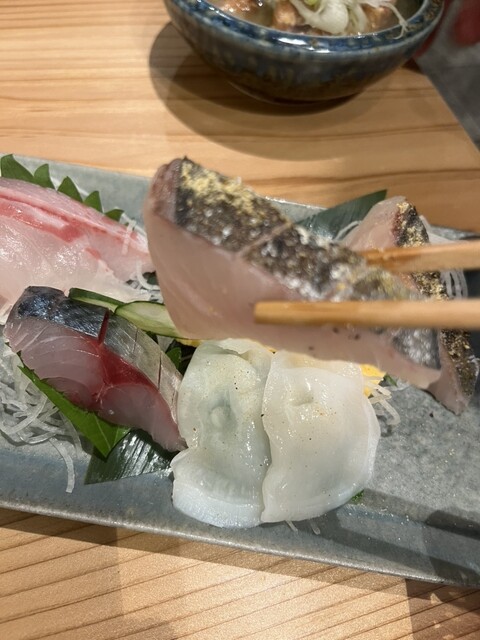 刺身盛り合わせはハマチ、水タコ(カツオ塩)、炙りさわら(ゆず塩)、たい、豊後サバと豪華で鮮度も文句なし。