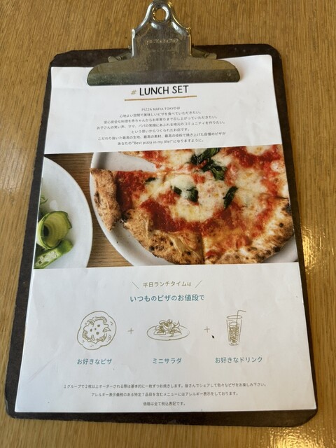 店内のサイネージにピザの人気順位、焼窯情報、ドレッシングのレシピ、オーナー情報などが表示されるので飽きないですね。これらの情報を理解した上で、ロマーナ1,960円税込、しらすと実山椒2,180円をコール。平日ランチはサラダとドリンクがサービスされるのでかなりお得です。