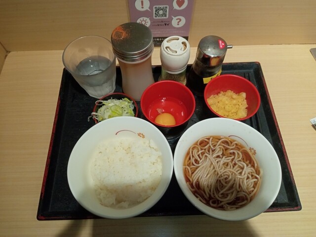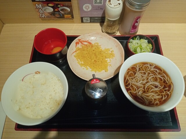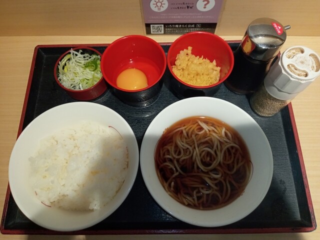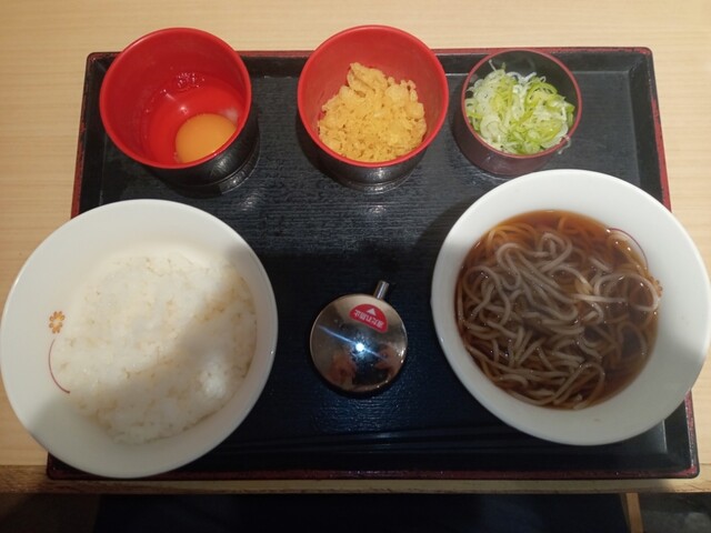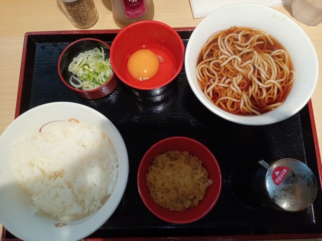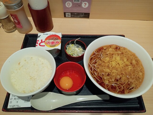 朝食セット¥480 たぬきそば(通常サイズ)&ライス&生玉子&納豆