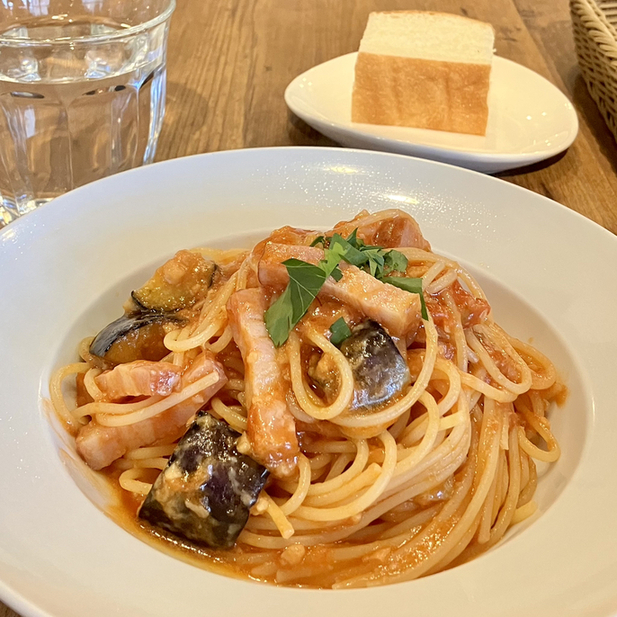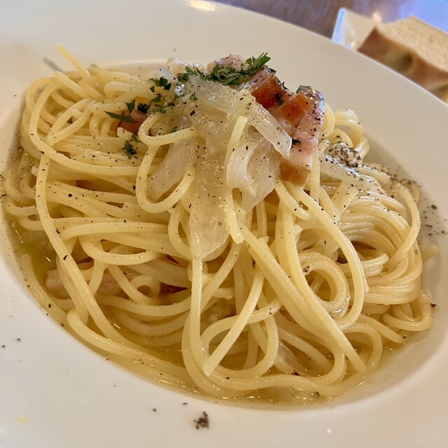 アスパラは瑞々しい食感、独特の香りで食が進みます。ブラックペッパーのピリッとした辛みがいいアクセントに。オイルパスタはわずかに糸を引くくらいチーズをまとっています。残ったスープ状の汁もコク深く、フォカッチャできれいにいただきました。サラダのドレッシングはブドウです。