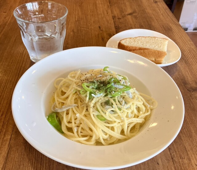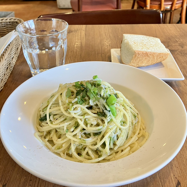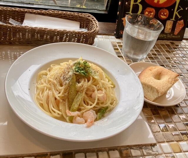 エビとアスパラのオイルパスタ(税込み1200円、アイスコーヒー追加210円)。