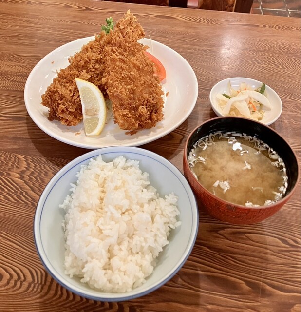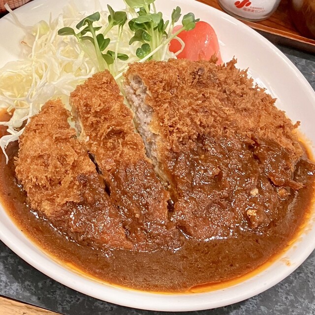 厚めのベーコンのフライが4切れ乗っています。揚げたての、ザクッとして重みのある衣の感触。ベーコン独特の香りがフワリと広がり、ジューシーな旨みを感じます。たっぷりの千切りキャベツにトマト、お新香、ご飯に熱々の味噌汁。きちんとした定食をしっかりいただけるメニューです。