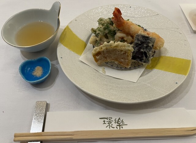 進 肴 たらば蟹かき揚げ 海老新引き揚げ 野菜二種 薬味 美味出汁 柚子塩 → お出汁、柚子塩良い塩梅です。好みは柚子塩味を引き締めて良いかも、海老ぷりぷり、たらば蟹は揚げでも美味い