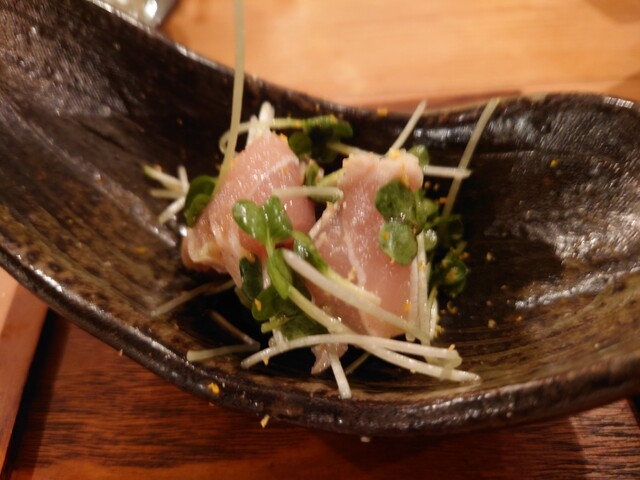 最初にでてきたのが焼鳥でネギま・砂肝・せせり・レバー・鴨葱といただきましたが、どれも大変美味しく、追加でツクネを注文です。コースですので、なめこ玉子・鳥刺し・もも焼きもいただきましたが、どれもパーフェクトに美味しいです。