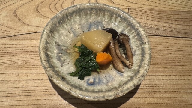 まずは炊き合わせ。青首大根、鮑松茸、ほうれん草、にんじん。