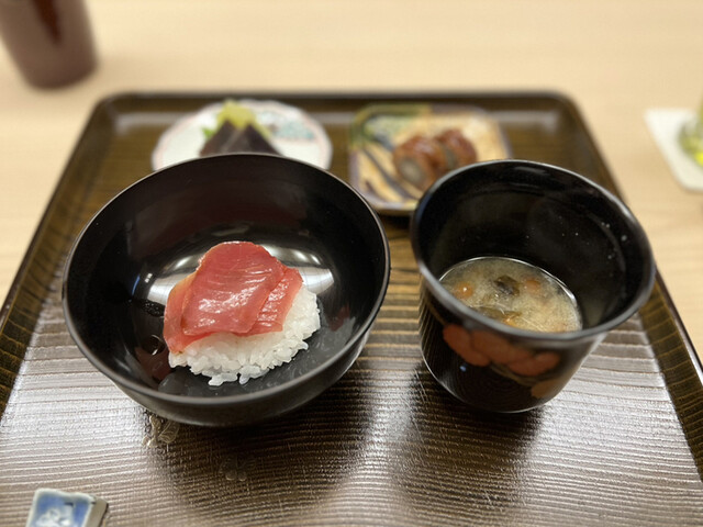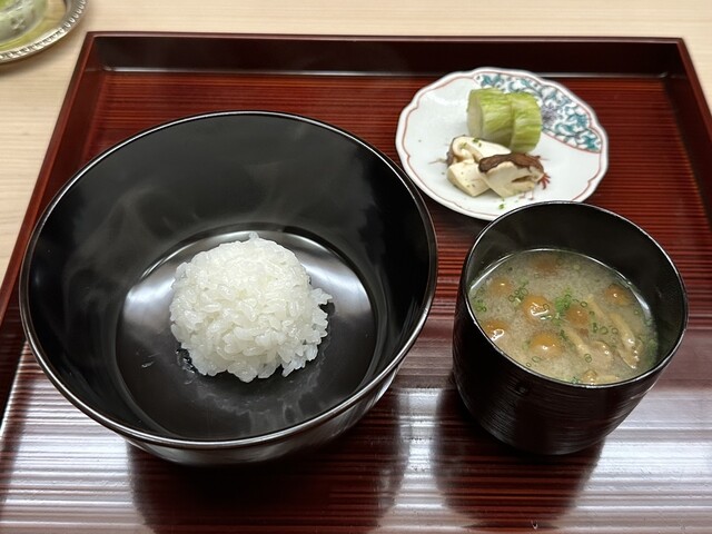 ・白ご飯、八幡巻き、なめこと筍の姫皮の味噌汁、香の物