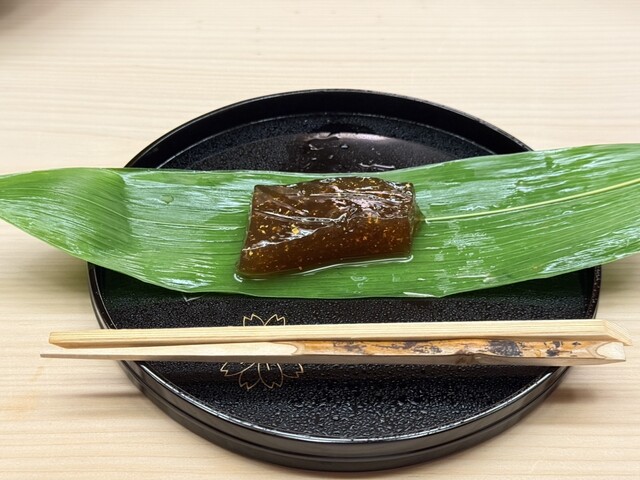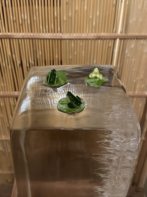 この日は、蓮の葉の飯蒸し、とうもろこしの天ぷら、すっぽんの煮凝り、和え物3点盛り、水玉おくらのお椀など、毎回訪問する度に新しいメニューを考案されている片折さん。