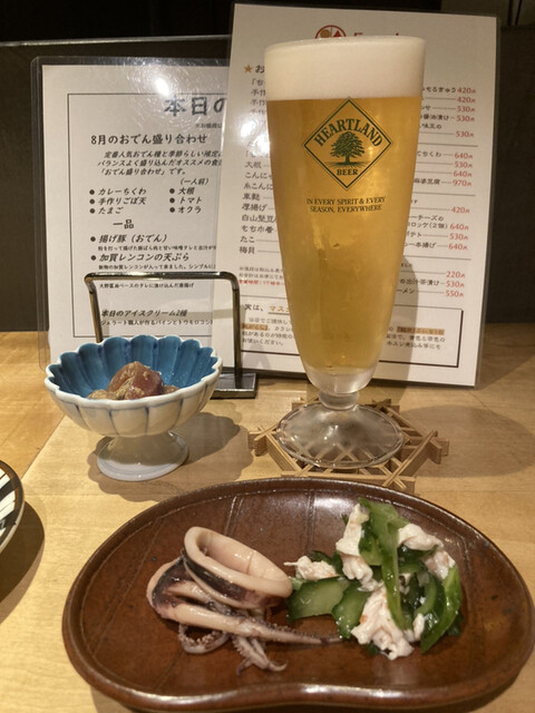 ビールとともに突き出しを頂きながら、8月のおでんを