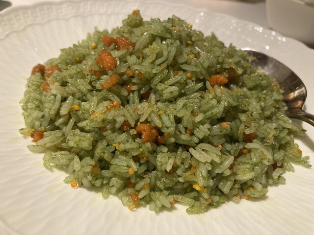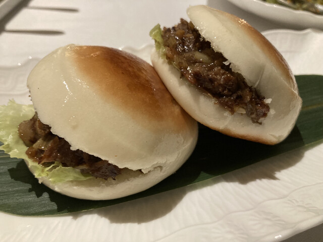 炒飯は翡翠色でナッツなどもあしらって立体感のある味わいです。どんどん入っていきます。変わったところで、中華風ハンバーガー。中華まんのバンズに焼き目がついていて、和牛の時雨煮のような感じのものが挟んであります。